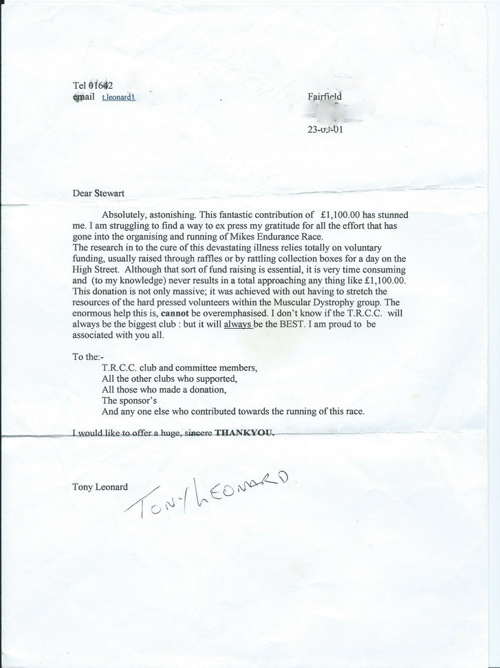 In his honour the club started what became one of the highlights of our year, The Mike Leonard Endurance event. All fees and donations were sent to the local Muscular Dystrophy Society branch. Below are some of the responses we received over the years.