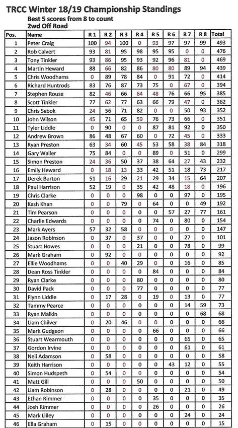 During the winter 2018-2019, we ran 2 concurrent championship series. On alternate weeks we ran the Touring cars as the main class and the following weeks we had the Off-road class scoring points. The results can be seen from links in menu. Final tables are below.